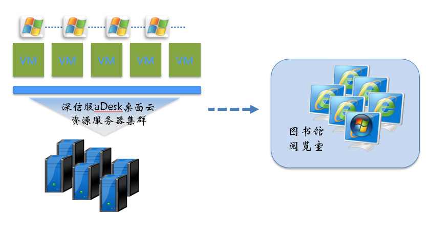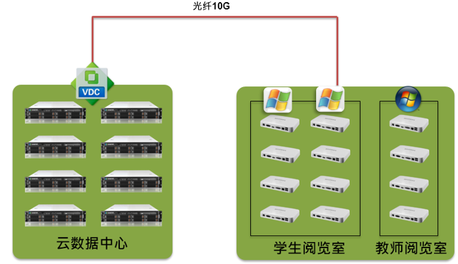 針對(duì)用(yòng)戶現(xiàn)有(yǒu)的(de)問(wèn)題和(hé)需求,深信服雲桌面為(wèΩi)用(yòng)戶提供了(le)高(gāo)性價比和(hé)高(gāo)附加值的(de)解決方案。整體(tǐ)方案采用(yòng)深信服桌面雲一(yī)體(tǐ)機(jī✔)VDS-G-H550,深信服桌面雲系統aDesk、将傳統PC應用(yòng)轉化(huà)成虛拟機(jī)上(shàng),托管在數(shù)據中心。客戶使用(yòng)節能(néng)、無§噪音(yīn)、小(xiǎo)巧的(de)超雲雲終端設備替代傳統PC,打造高(gāo)效的(de)數(shù)字化(huà)校(xiào)園。