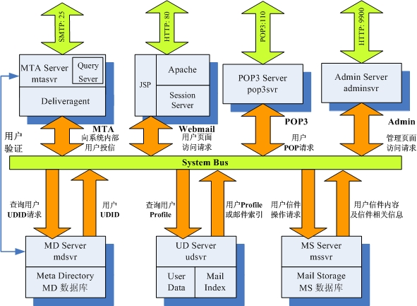 郵件(jiàn)系統設計(jì)為(wèi)包含:MTA、Webmail、POP、Admin、Administrator、System、MD、UD及MS等系統功能(né≈ng)模塊,共同完成郵件(jiàn)的(de)分(fēn)撿、存儲、發送等工(gōng)作(zuò)。MTA、Webmail、POP、Admin四個(gè)模塊主要(yào)與用(yò¥ng)戶交互,實現(xiàn)郵件(jiàn)系統的(de)各種功能(néng),是(shì)郵件(jiàn)系統的(de)前端模塊;而MD、UD、MS↑三個(gè)模塊主要(yào)實現(xiàn)前端功能(néng)模塊與數(shù)據庫之間(jiān₩)的(de)通(tōng)信,作(zuò)為(wèi)郵件(jiàn)系統的(de)後端模塊。