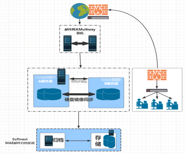 數(shù)據分(fēn)别存儲在兩台服務器(qì)本地(dì),增加了(le)數(shù)據的(de)冗餘性、安全性和(hé)可(kě)靠性,不(bù)會(huì)因為(wèi)方"案一(yī)中“存儲設備單點故障”造成數(shù)據丢失。數(shù)據同步則使用(yòng)U-Mail郵件(jiàn≠)系統提供的(de)同步模塊進行(xíng)同步,由于此同步模塊是(shì)基于內(nèi)核模塊實現(xiàn)塊設備同步,所以可(kě)以很(hěn)好(hǎo)解決兩台服務器(qì)數(shù)據不(bù)一(yī)緻的(de)問(wèn)題,保證兩台服務器(qì)數÷(shù)據一(yī)模一(yī)樣(字節數(shù)也(yě)一(yī)樣)。